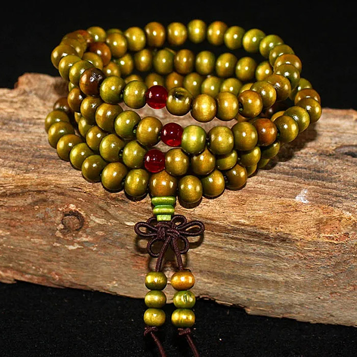 108 szemes, fából készült mala, 8 mm átmérőjű szemekkel. A mala áldott.