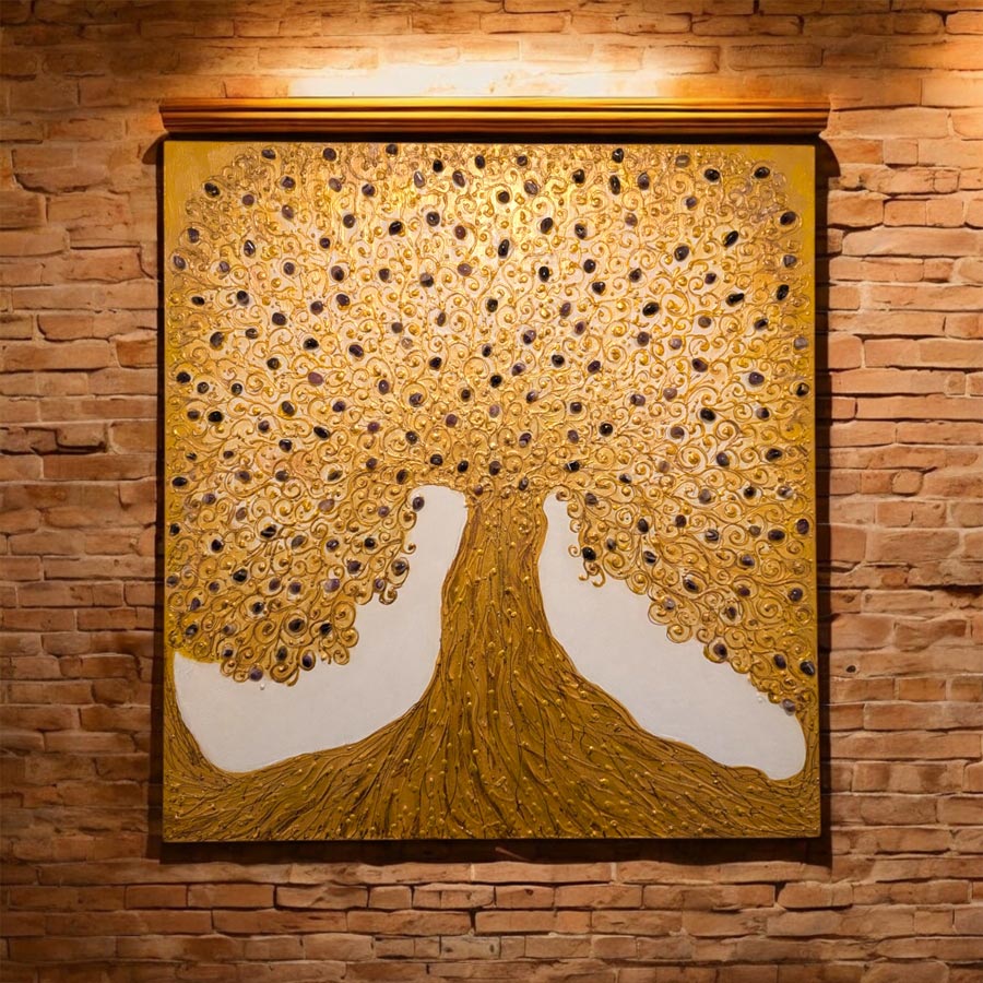 Egyedi design: Az életfa arany színű, részletgazdag mintái és a valódi ametiszt ásványok különleges mélységet és energiát adnak a festménynek.