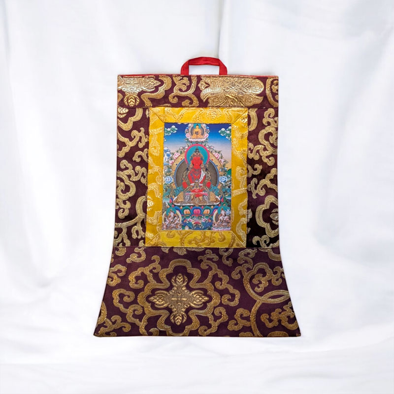 Nepáli kis méretű thangka, nagyon jó minőségű, élesen nyomtatott képpel, selyembrokátba varrva. Azonnal falra akasztható.