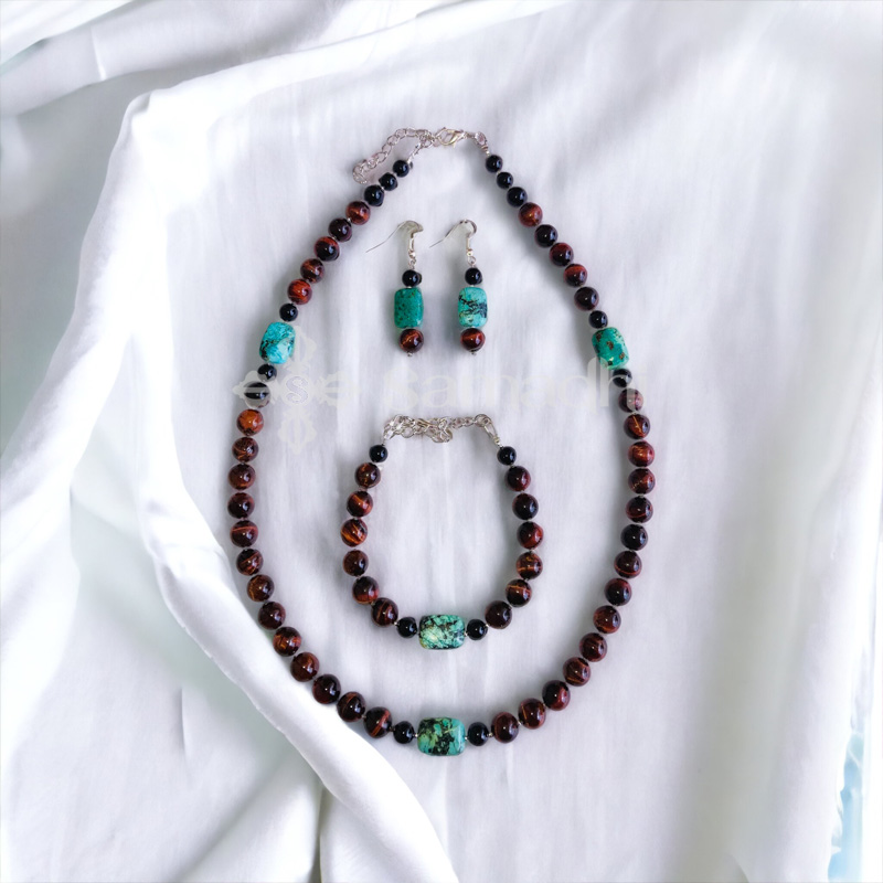 Aphrodite ékszer szett valódi türkiz, macskaszem, és ónix féldrágakő ásványokból készítve.