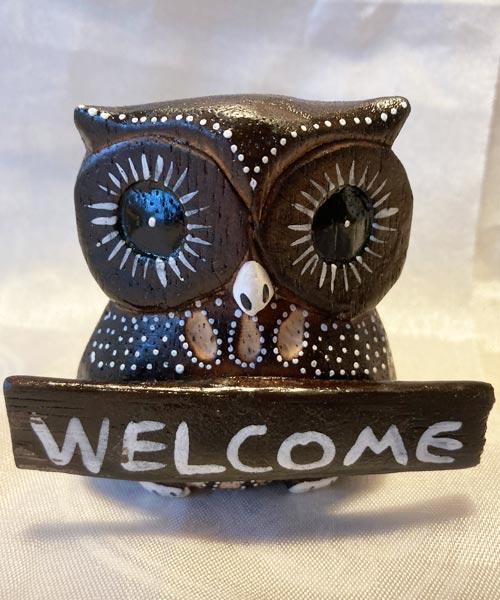 Indonéz faragott bagoly szobor fából, üdvözlő táblával.
