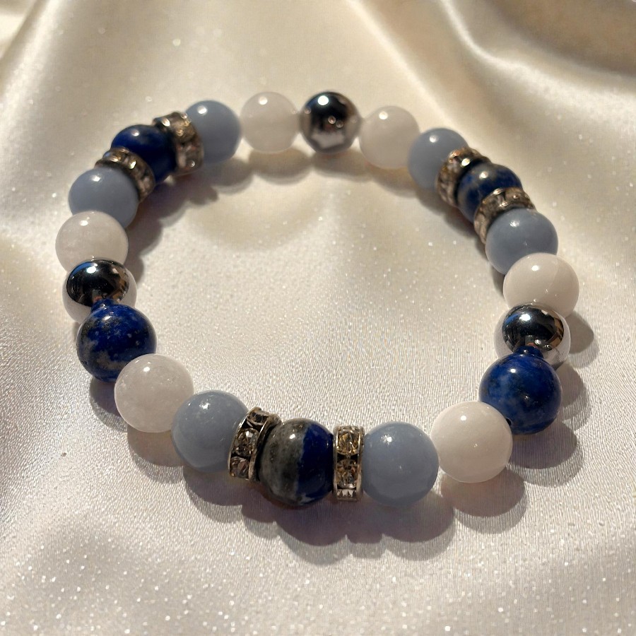 Ez az összeállítás sokak számára egyfajta belső rendrakás szimbóluma. Az angelitet gyakran társítják a megnyugváshoz és az őszinte önkifejezéshez, a lápisz lazulit a tiszta gondolkodáshoz és a belső igazság felismeréséhez, míg a jáde a harmónia és az arányérzék klasszikus ásványa. A hematit földelő karaktere segít abban, hogy ez a finom, világos minőség ne váljon szétszórttá, hanem a mindennapokban is jól hordható, kiegyensúlyozott ékszerként jelenjen meg.