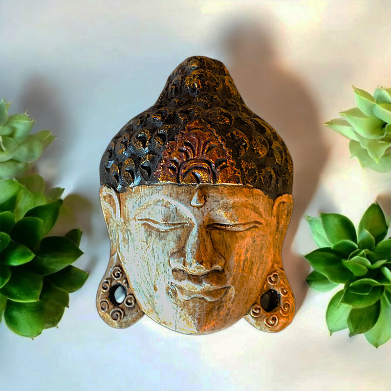Buddha maszk fából faragva, hátulján akasztóval ellátva.
