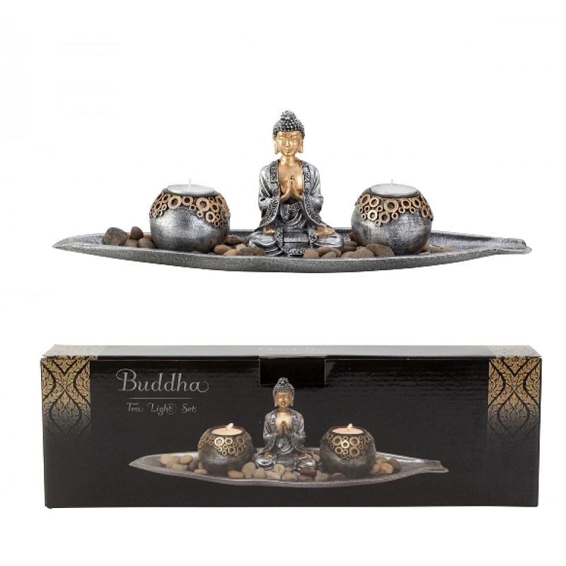 Igazán mutatós Buddha szett 2 db teamécses tartóval, hossza: 40 cm. Anyaga: műgyanta.