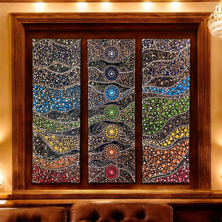 Ez a triptichon nemcsak dekoráció, hanem egyedi műalkotás, amely életet visz otthonába. A színek és minták dinamikája tökéletesen illik modern és klasszikus enteriőrökbe egyaránt, miközben a kézzel készült részletek különleges értéket képviselnek.