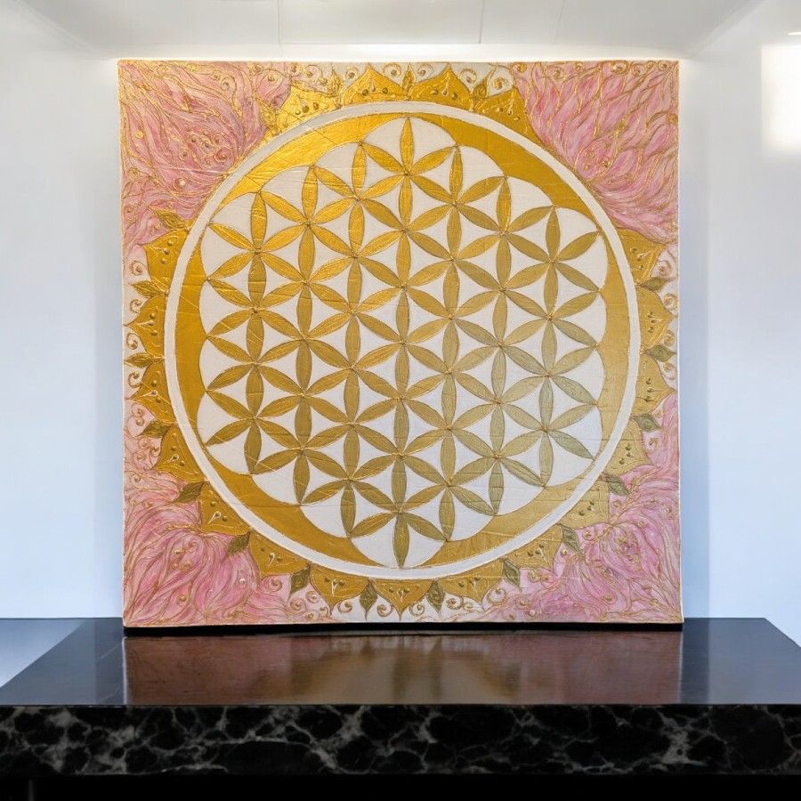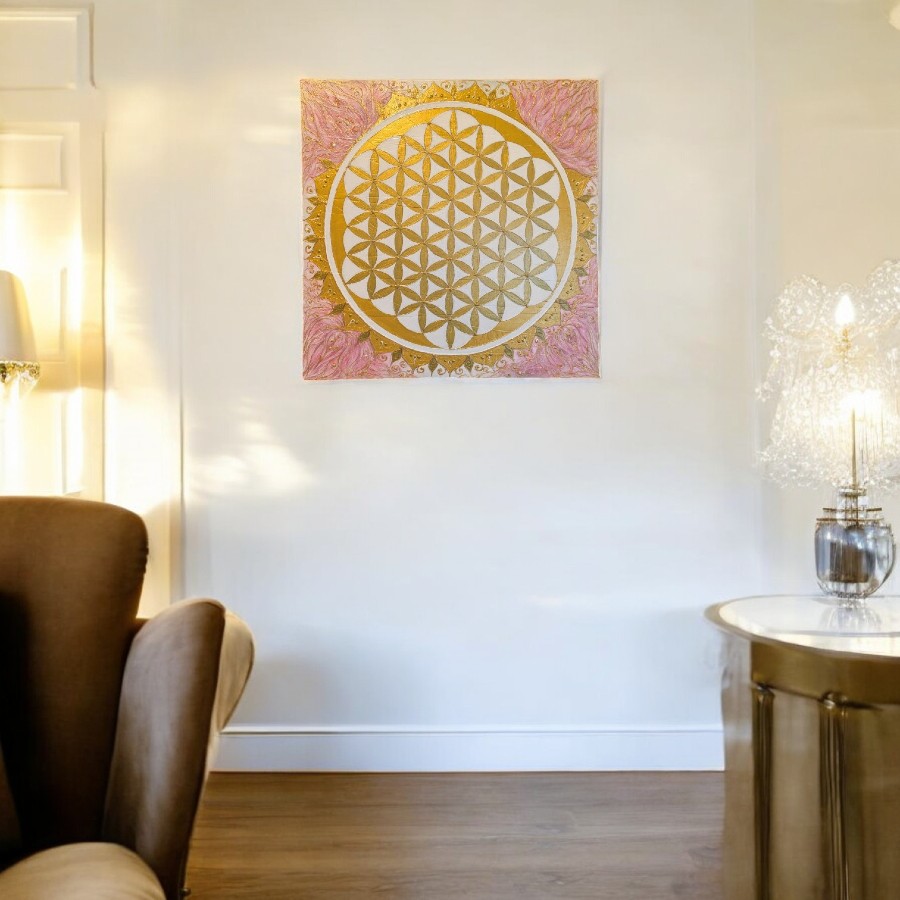Ez a gyönyörű, 50×50 cm-es kézzel festett Élet Virága festmény a spirituális szimbólumok és a művészet tökéletes találkozása. Az arany színben ragyogó Élet Virága szimbólumot finoman stilizált lótuszok veszik körül, amelyek eleganciát és mély spirituális jelentést kölcsönöznek a műalkotásnak. A festmény kifinomult energiájával és harmonikus színeivel szinte bármilyen környezetbe illeszkedik, legyen az otthon, iroda vagy meditációs tér. Azonnal kihelyezhető, hogy pozitív energiát és nyugalmat sugározzon a térbe.