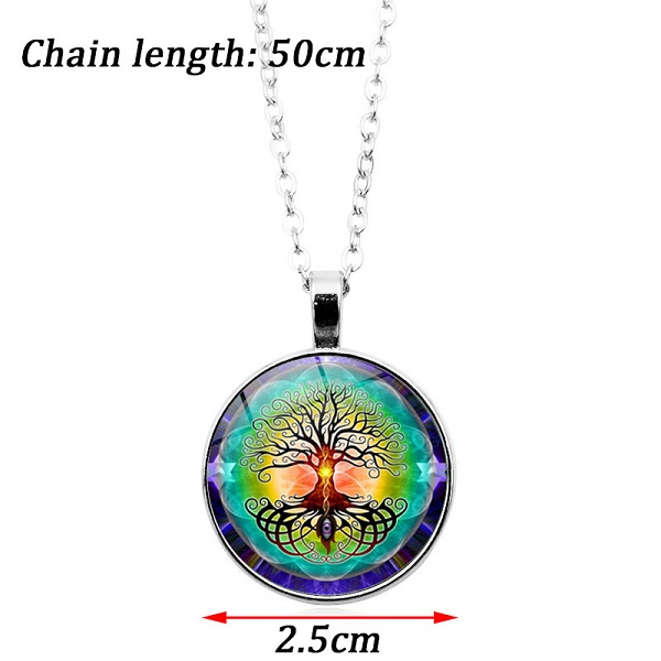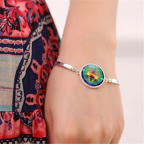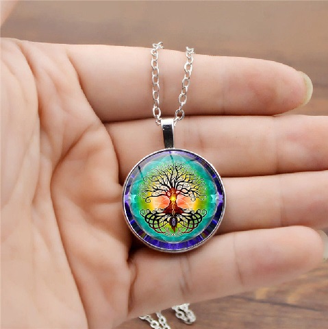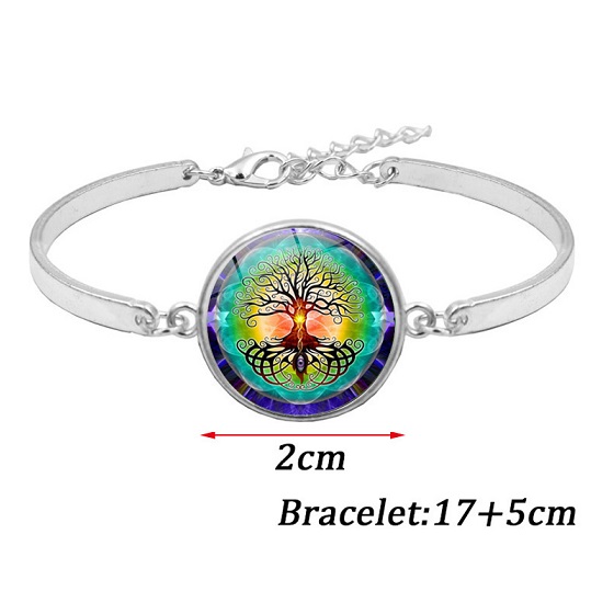 Gyönyörű életfa ékszerszett üveg medálokkal. A teljes szett tartalmaz egy állítható méretű nyakláncot, egy állítható méretű karkötőt, és egy pár fülbevalót.