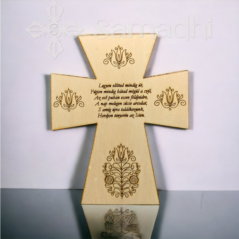 Fából készült kereszt falikép gravírozott régi áldással. Natúr fa színű, és lakkréteggel védett. Akasztóval van ellátva a hátulján, így igény szerint azonnal falra helyezhető.