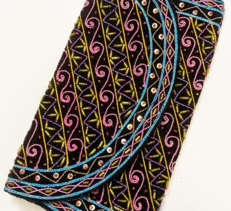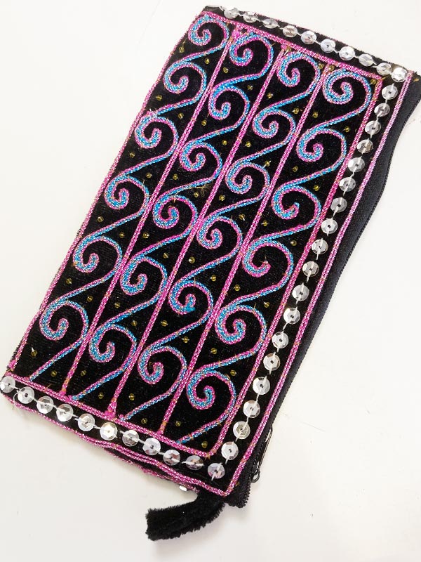 Burmai erszény tradicionális gyöngyhímzéses díszítéssel mindkét oldalán. Bársonyszövetből készült, 1 zippzáras nagy zsebbel.