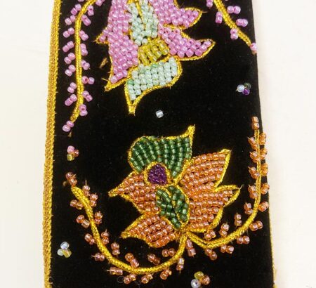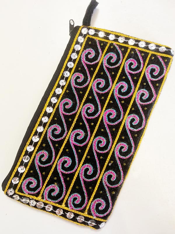 Burmai erszény tradicionális gyöngyhímzéses díszítéssel mindkét oldalán. Bársonyszövetből készült, 1 zippzáras nagy zsebbel.