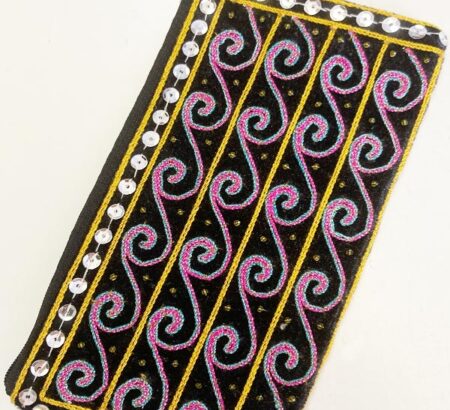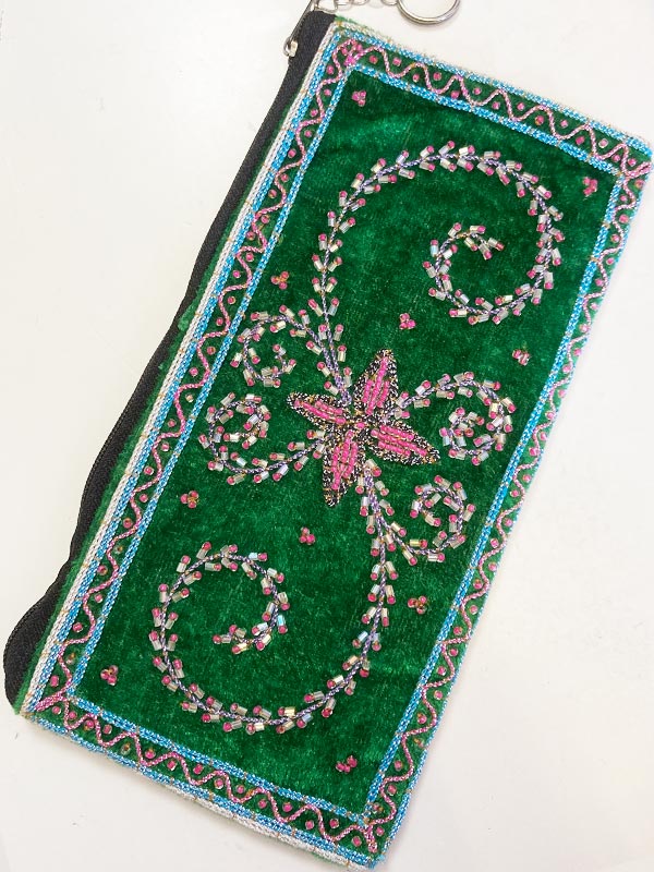 Burmai erszény tradicionális gyöngyhímzéses díszítéssel mindkét oldalán. Bársonyszövetből készült, 1 zippzáras nagy zsebbel.
