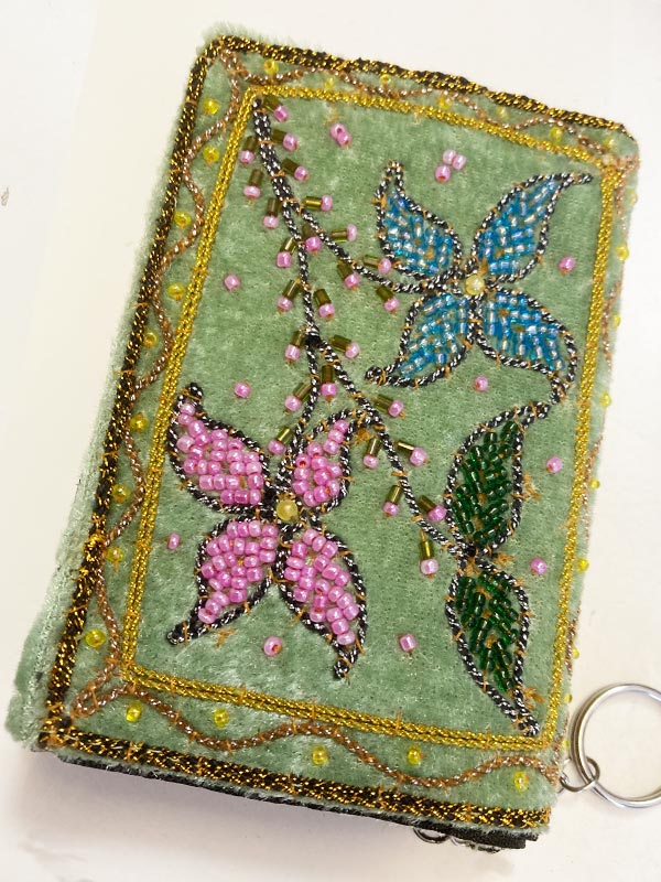 Burmai erszény tradicionális gyöngyhímzéses díszítéssel mindkét oldalán. Bársonyszövet alapanyag, 2 zsebes, ebből az egyik zippzáras.