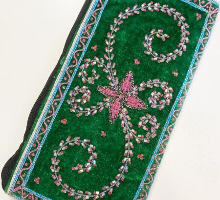 Burmai erszény tradicionális gyöngyhímzéses díszítéssel mindkét oldalán. Bársonyszövet alapanyag, 2 zsebes, ebből az egyik zippzáras.