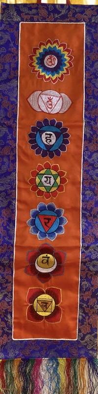 Akasztó nélkül 95 cm magas gyönyörűen hímzett 7 csakra szimbólumos fali függő Nepálból.