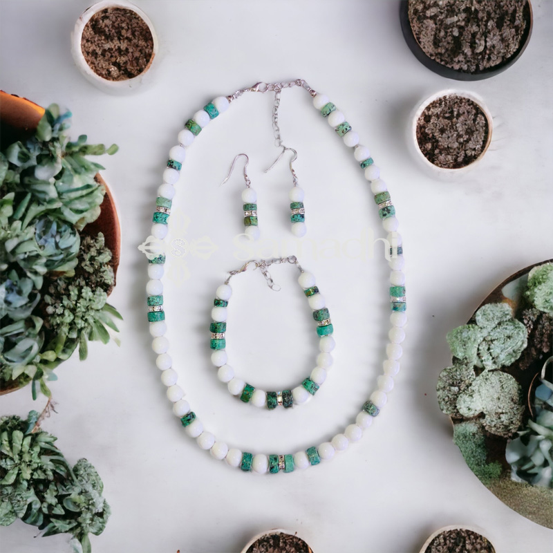 Az Infinity Szett egy gyönyörű, türkiz-kagyló ásvány ékszer szett, amelyet a Samadhi tervezett és készített. Ez az ékszerkollekció különleges és elegáns megjelenést kölcsönöz a viselőjének.