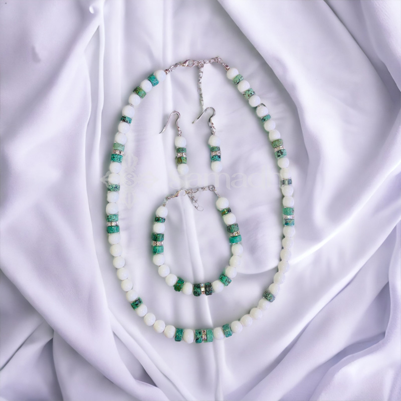Infinity Ásvány ékszer szett valódi türkiz és kagyló szemekkel készítve.