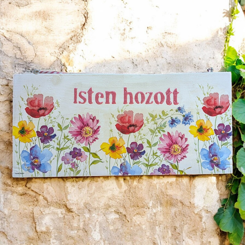 Egyedileg alkotott, kézműves, Isten hozott feliratos üdvözlő tábla falikép. Szöggel vagy csavarral 2 ponton a falhoz rögzíthető, vagy akasztható, amihez 2 akasztó van a faliképen.