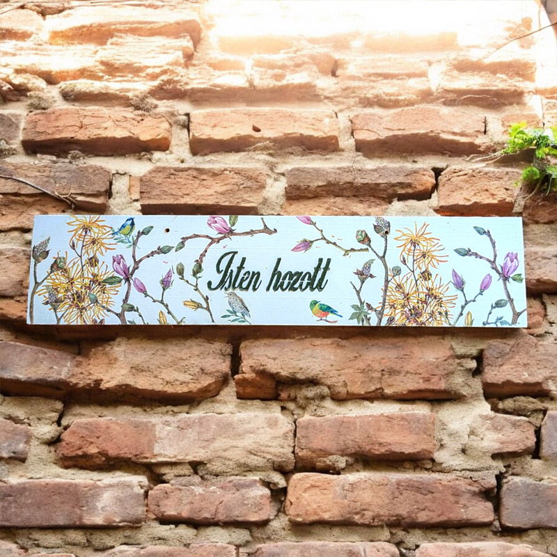 Egyedileg alkotott, kézműves, Isten hozott feliratos üdvözlő tábla falikép. Szöggel vagy csavarral 2 ponton a falhoz rögzíthető, amihez 2 furat van a faliképen.