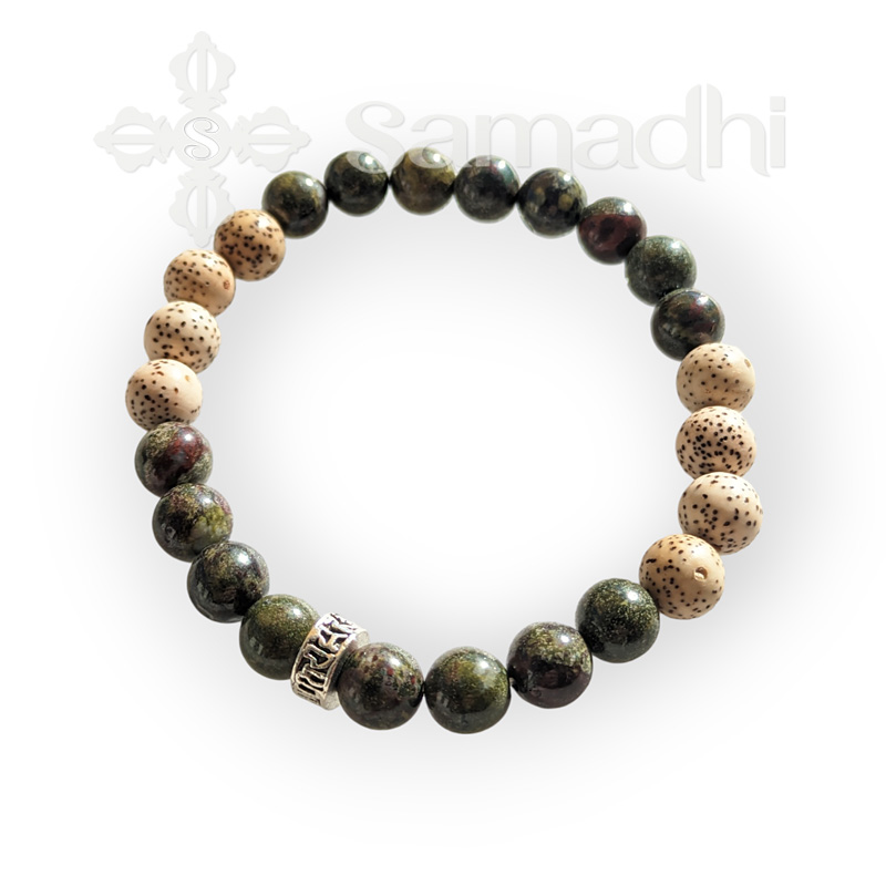 Sárkány jáspisból és lótuszmagból készült egyedi karkötő, rugalmas dupla szálú damilra fűzve. Om Mani Padme Hum mantra osztja a karkötőt.