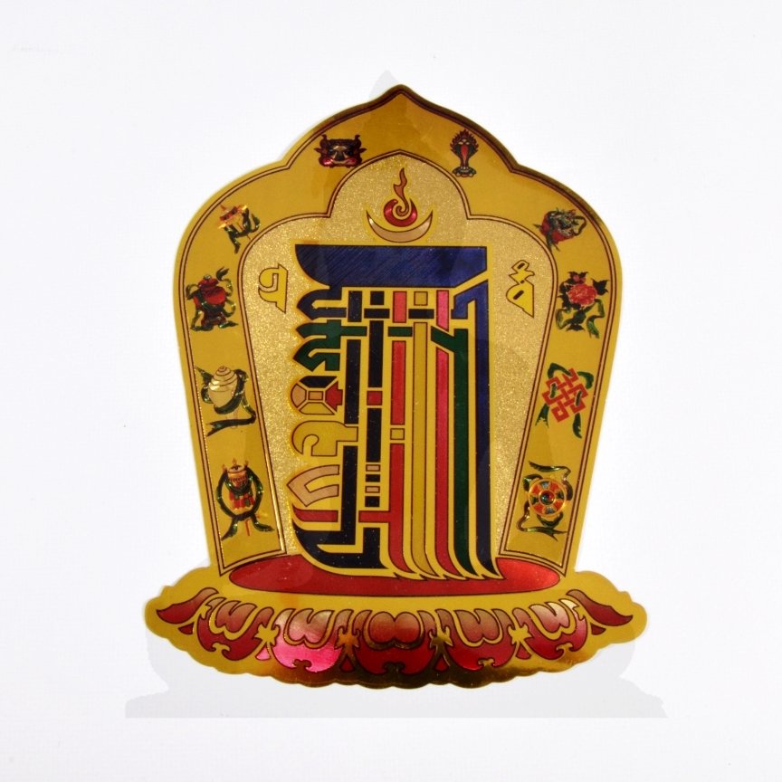 Kalacsakra szimbólummal díszített matrica. Mérete: 12 cm magas.