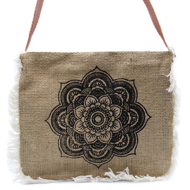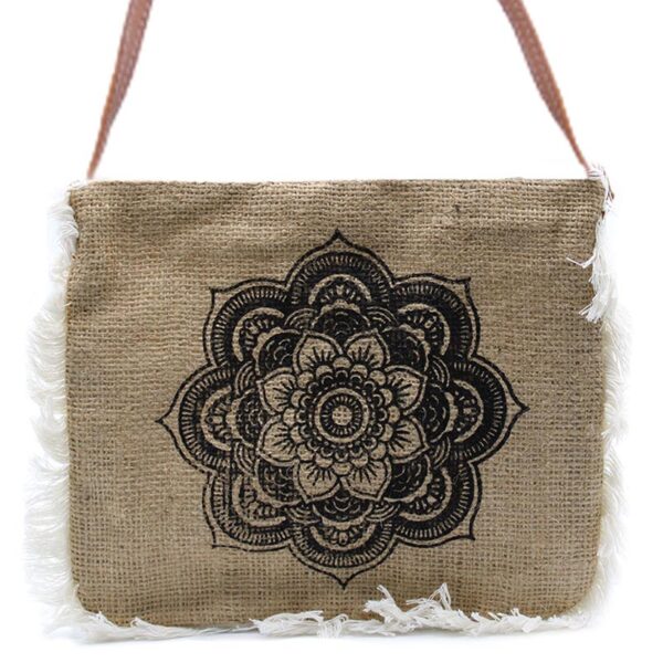 Jutából (kelet-indiai növényi rost alapú erős szövet) készült válltáska mandala mintával, rojtokkal díszítve.