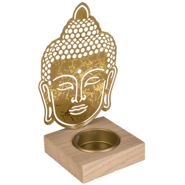 Mécsestartó fából készült talapzattal és arany színű antikolt fém hátlappal.