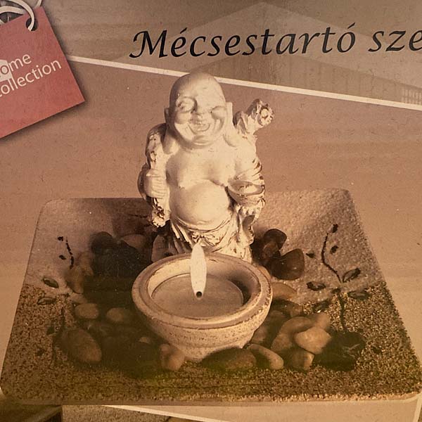 Kis méretű berendezhető „zen kert” pocakos Buddha szoborral és mécsestartóval.