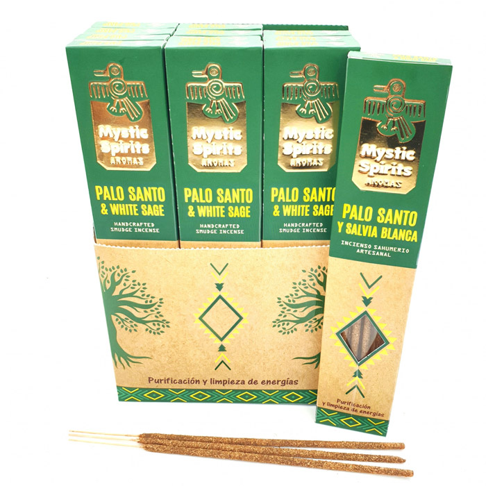 A Mystic Spirits Palo Santo & Fehér Zsálya füstölőpálcái két ősi növény erejét egyesítik: a dél-amerikai sámánizmusból ismert Palo Santo és az észak-amerikai indián hagyományokból származó Fehér Zsálya egyszerre tisztítja meg a teret, az aurát és a tudatot.