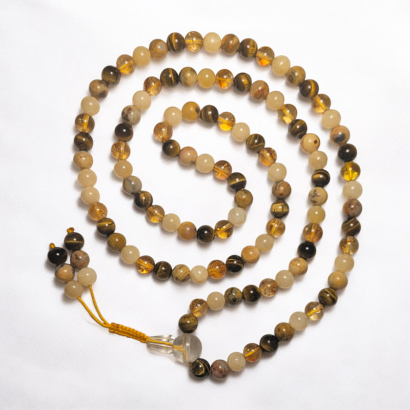 A mala ásványai: tigrisszem, citrin, csipke achát, pakisztáni ónix.