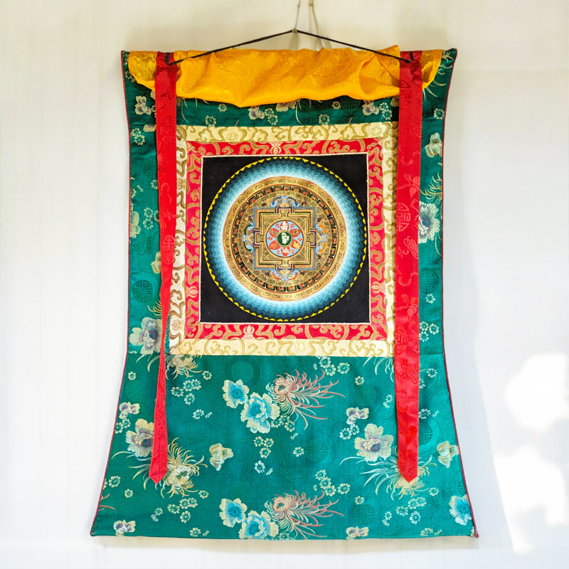 Kézzel festett eredeti buddhista mandala thangka kiváló minőségű brokáttal. Az Om Mani Padme Hum mantra található a mandala közepén a mantra lényegét jelképező HRI szimbólummal.