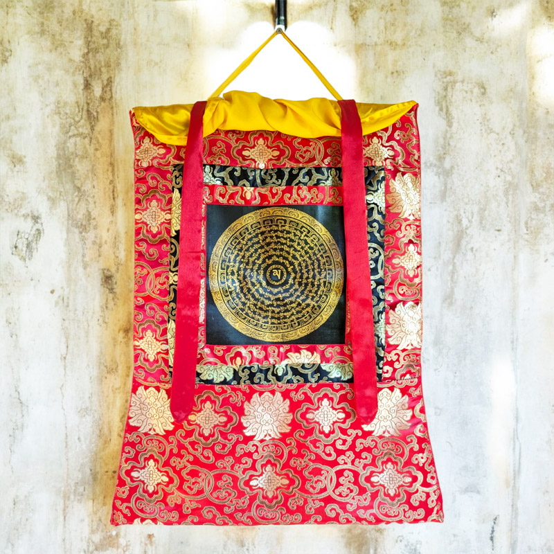 Kézzel festett eredeti buddhista mandala thangka kiváló minőségű brokáttal. Az Om Mani Padme Hum mantra látható az olajfestményen arany festékkel felfestve.