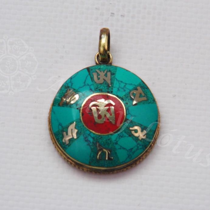 Türkiz medál OM MANI PEME HUNG és OM mantrával díszítve.