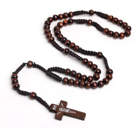 Hagyományos kialakítású keresztény rózsafüzér fából.