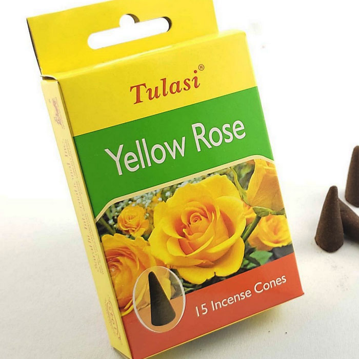 Sárga rózsa illatú kúpfüstölő indiai Tulasi kúpfüstölő, 1 csomagban 15 db kúpfüstölő van.