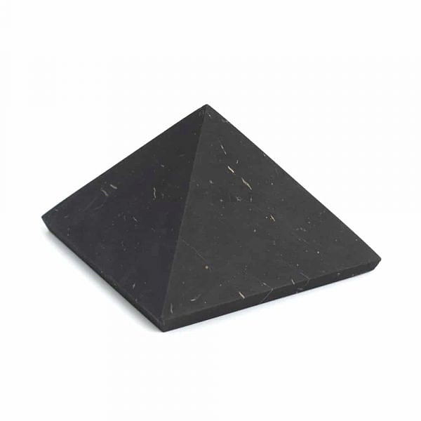 50 mm oldalszélességű shungit piramis Oroszországból. A shungit piramist elsősorban azon vélt tulajdonsága miatt használják, mert földelő, védelmező ásvány, ami elnyeli a káros sugárzásokat.