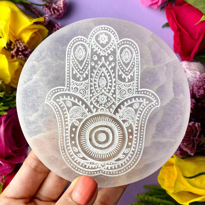 10 cm átmérőjű szelenit hangoló alátét gravírozott Hamza keze szimbólummal. 1 cm magas.