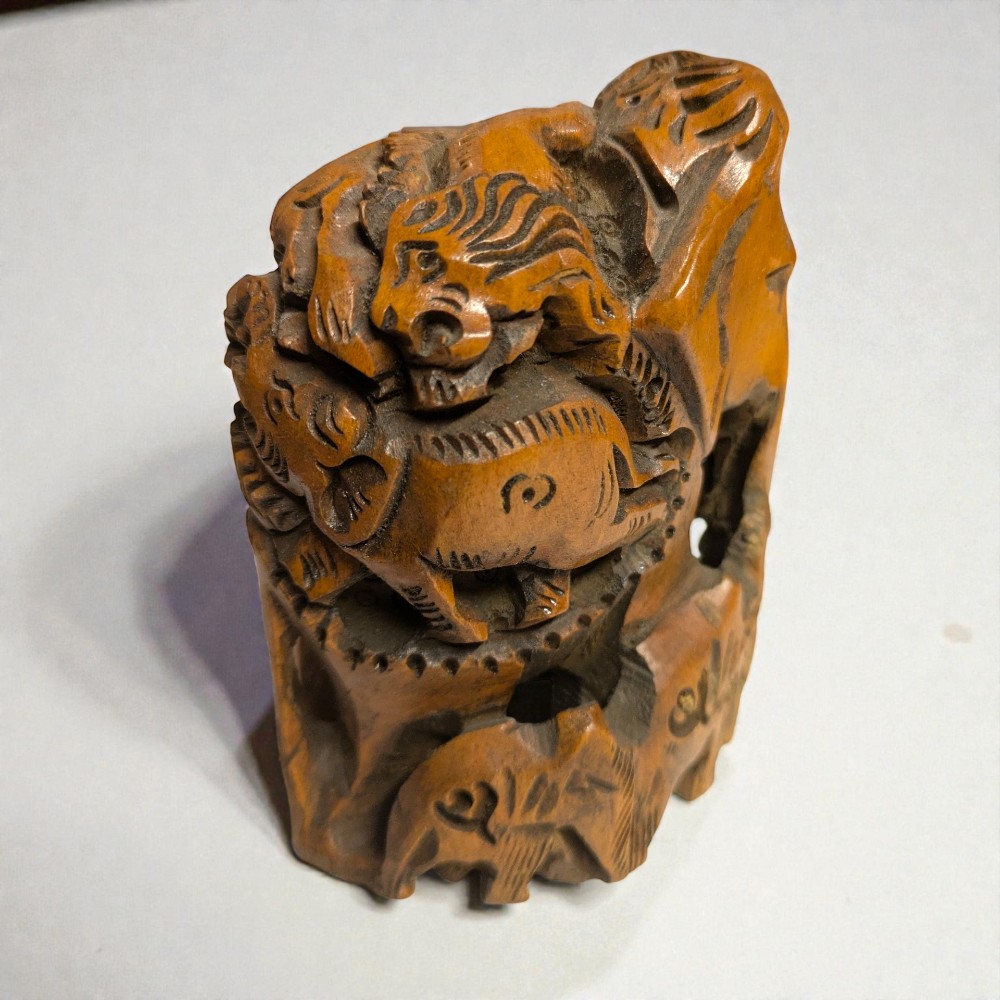 Ez a kézzel faragott, tömör fa elefántszobor jóval több, mint egy dekoratív állatalak. A 11 cm magas faragvány különlegessége abban rejlik, hogy az elefánt testére és környezetébe kisebb állatfigurák vannak beépítve. Ezek nem véletlenszerű díszítések, hanem tudatosan kialakított motívumok, amelyek egy összetett, régi szemléletmódot hordoznak.