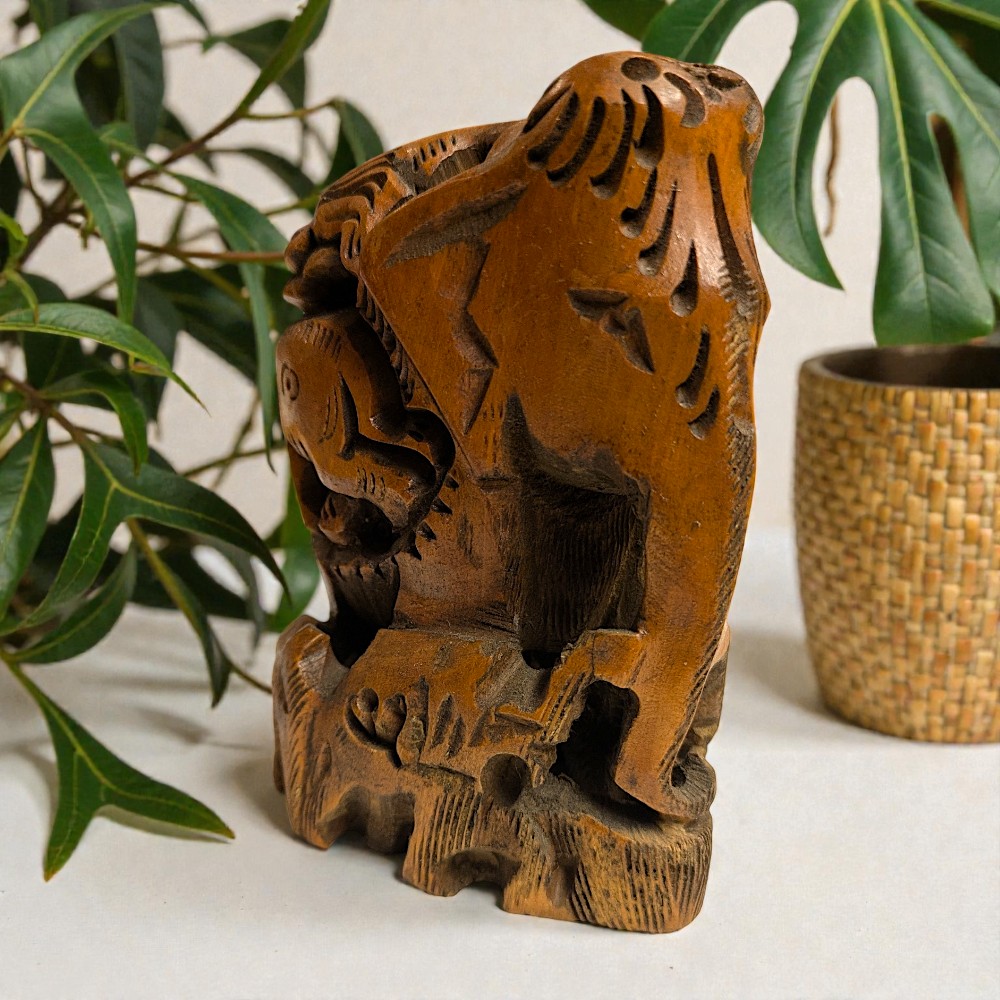 Dekorációként jól illeszkedik természetes anyagokat használó enteriőrbe, növények mellé, fa- vagy kőfelületekre. Nem harsány, mégis erős jelenléte van. Gyűjtők számára is érdekes darab, mert az ilyen összetett állatmotívumos faragások ritkábbak, mint az egyszerű, egyszereplős figurák.