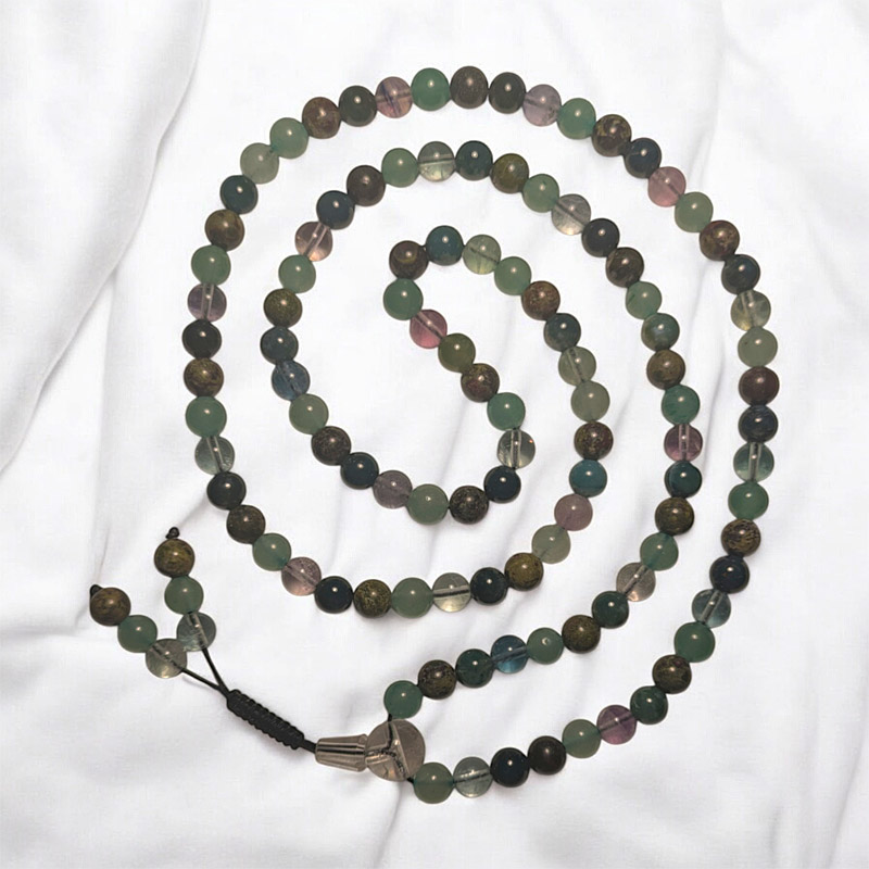 Hagyományos tibeti csúszócsomóval rendelkező, állítható szemtávolságú kézműves ásványmala. Használhatjuk szabadon gyakorlatainkhoz, meditációnkhoz, elcsendesülésünkhöz, vagy magunkon viselhetjük nyakban és csuklón hordva is. A malával való kontaktus energetikai élményt, harmonizációt, feltöltődést okoz.