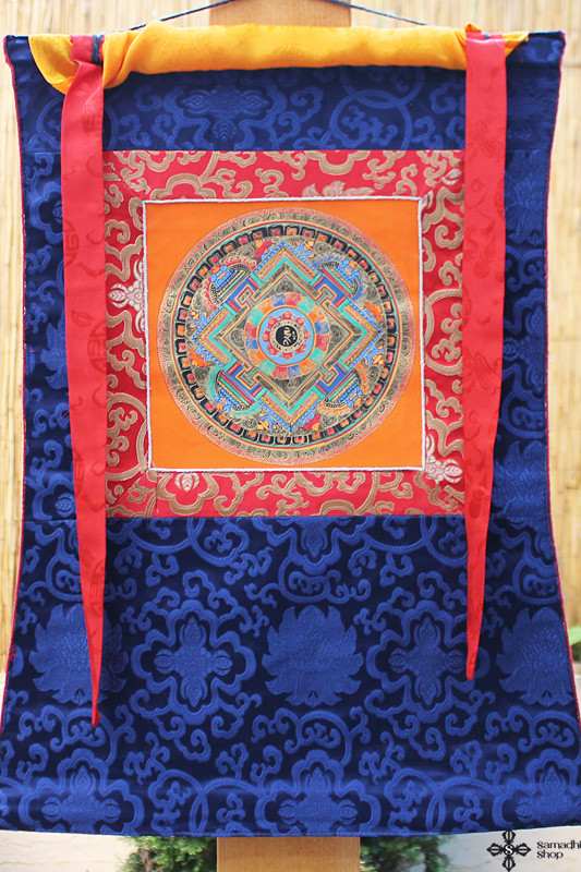 Eredeti nepáli kézzel festett mandala thangka. Mérete brokáttal együtt: kb. 45 x 60 cm. A thangka áldott.