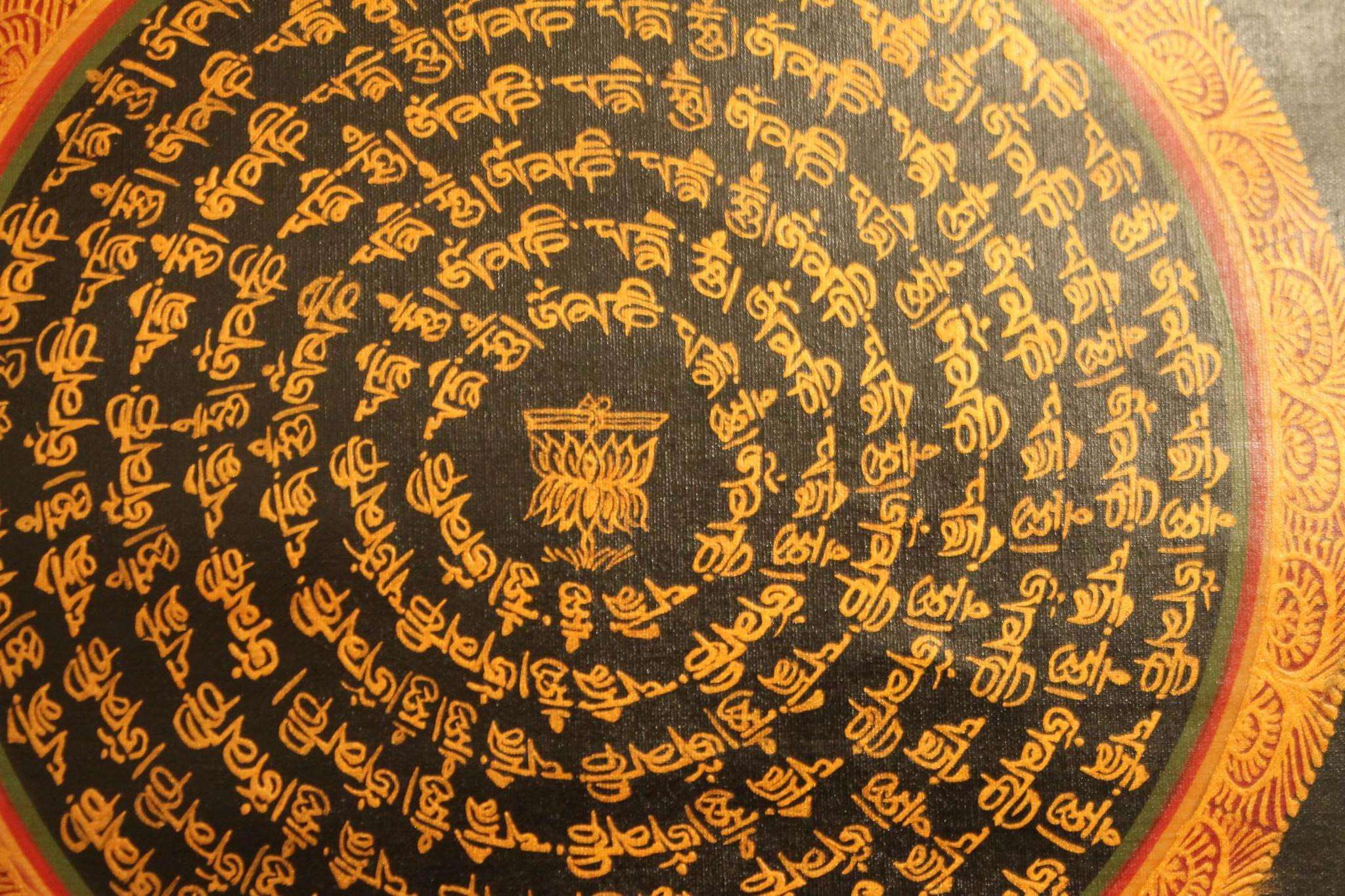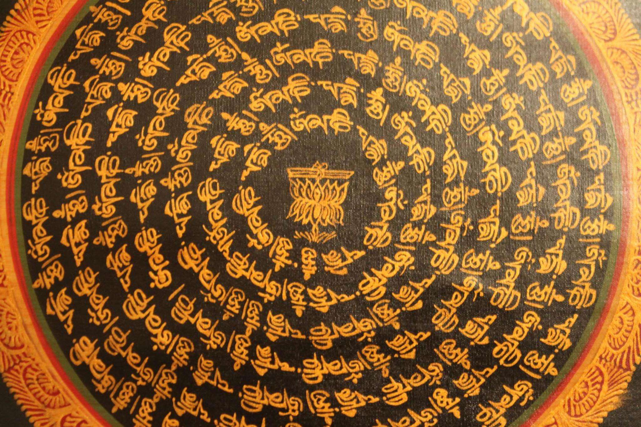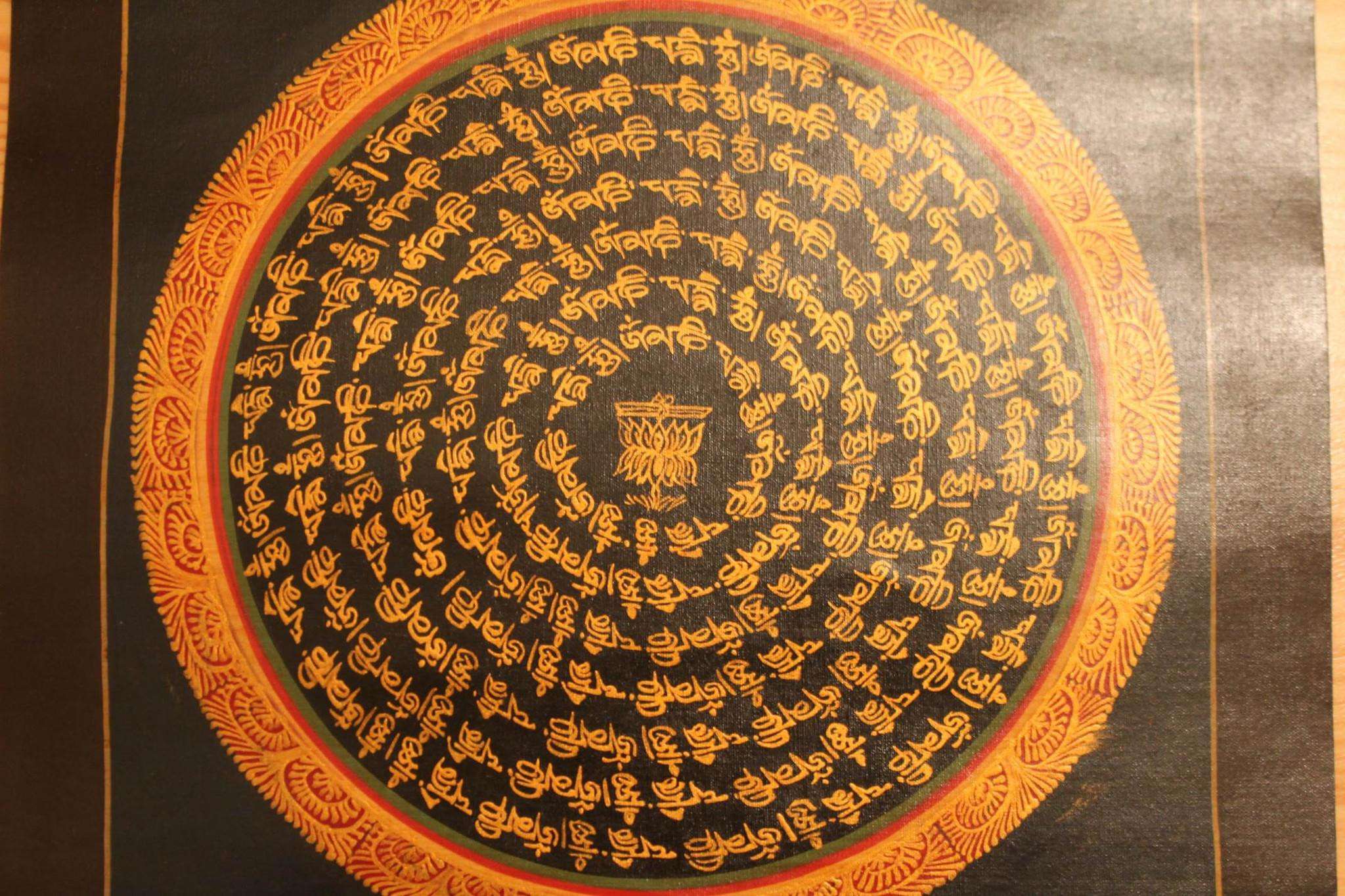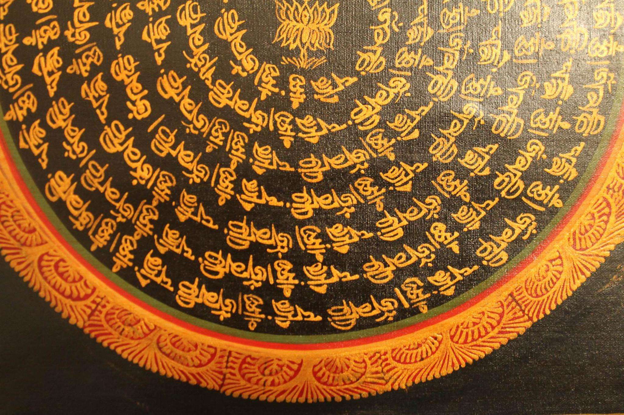 Eredeti nepáli kézzel festett buddhista mantra festmény festővásznon. A rajzolatokat aranyporos festékkel készítették, így azok a fényben csillognak.