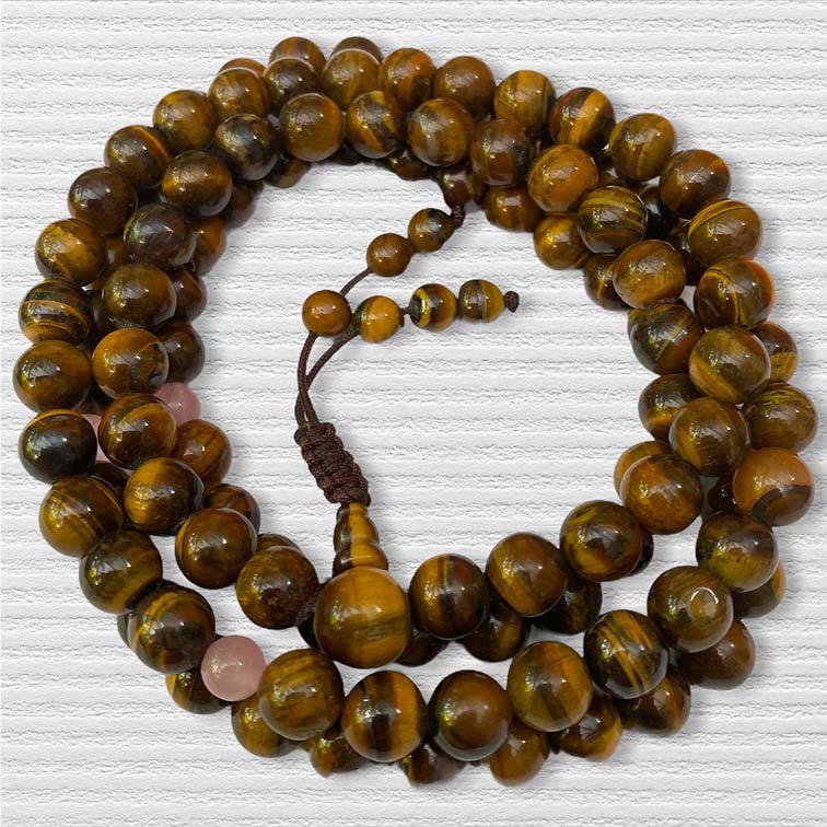 Gyönyörű nepáli tigrisszem mala rózsakvarc osztókkal. 108 szemes, 8 mm-es szemekkel. Állítható méretű, csúszócsomós.