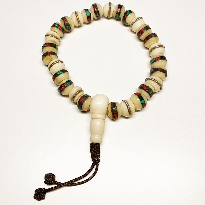 Türkiz-korall berakásos nepáli csont karmala. 27 szemes, 16 cm kerülettel. Rugalmas szálra fűzve.