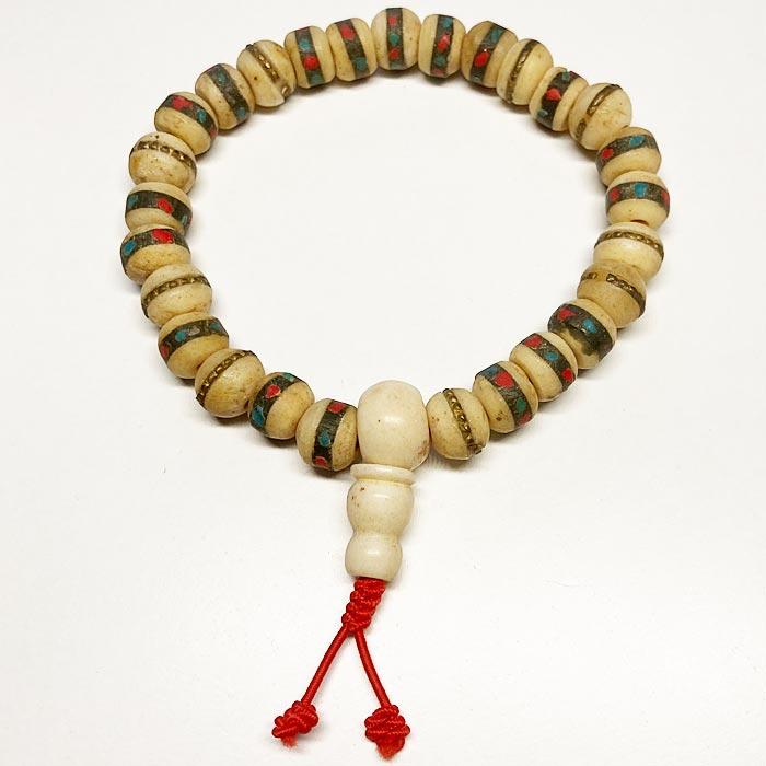 Türkiz-korall berakásos nepáli csont karmala. 27 szemes, 16 cm kerülettel. Rugalmas szálra fűzve.