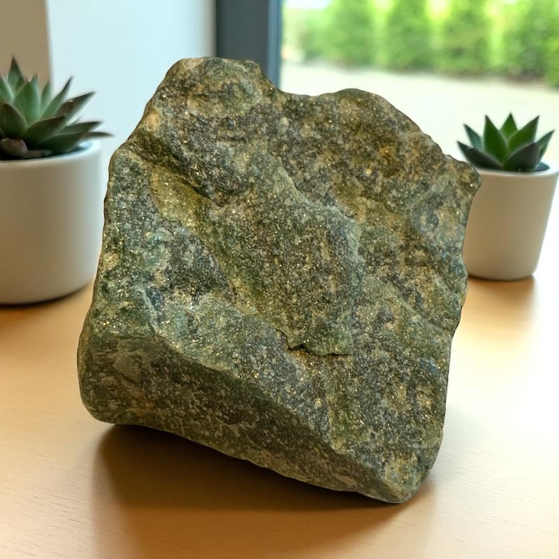 Ez a 40 grammos aventurin darab nyers formájában őrzi a természet erejét és nyugalmát. A kő felületén lágyan csillogó zárványok, fémes pontok és zöldes szürkés foltok váltakoznak, mintha a Föld mélyéből származó geológiai térkép elevenedne meg a kezünkben. A természetesség ereje ebben az ásványban teljes mértékben jelen van – egyszerre vad és gyógyító.